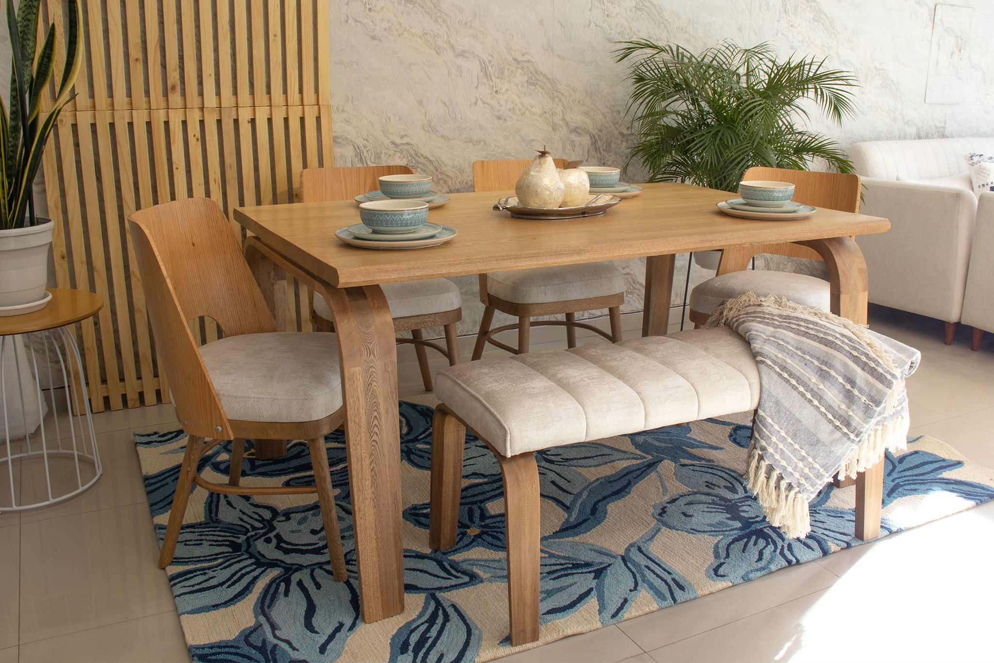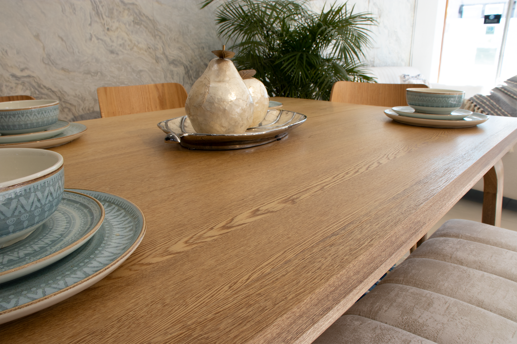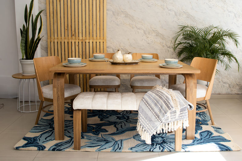 mesa odesa elegante y amplia en madera natural flor morado que ofrece al comedor un atractivo diseño, evidenciando el proceso natural de los cortes en sus materiales lo cual realza su belleza.