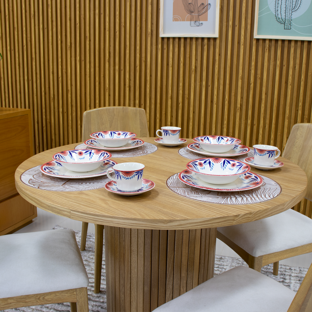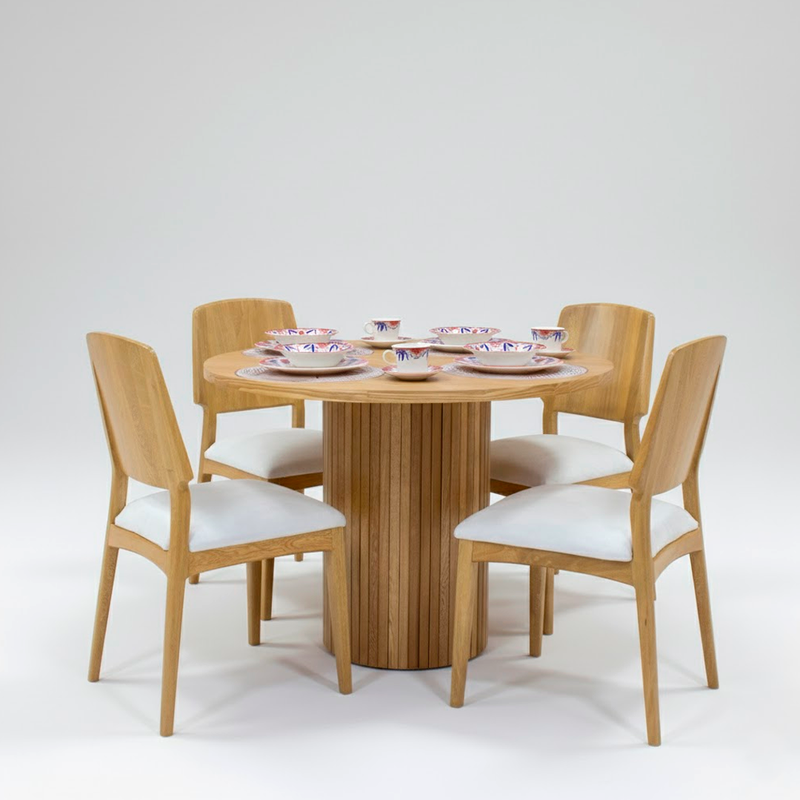La mesa está disponible en dos tamaños (Ø 1,10 m o Ø 1,00 m), ideal para espacios medianos y pequeños, brindando una distribución perfecta para compartir en familia o con invitados. Su forma redonda favorece la interacción y crea una atmósfera más cercana y acogedora.