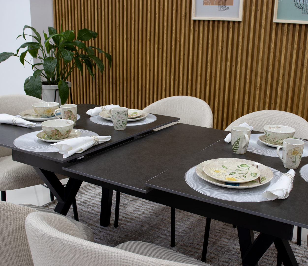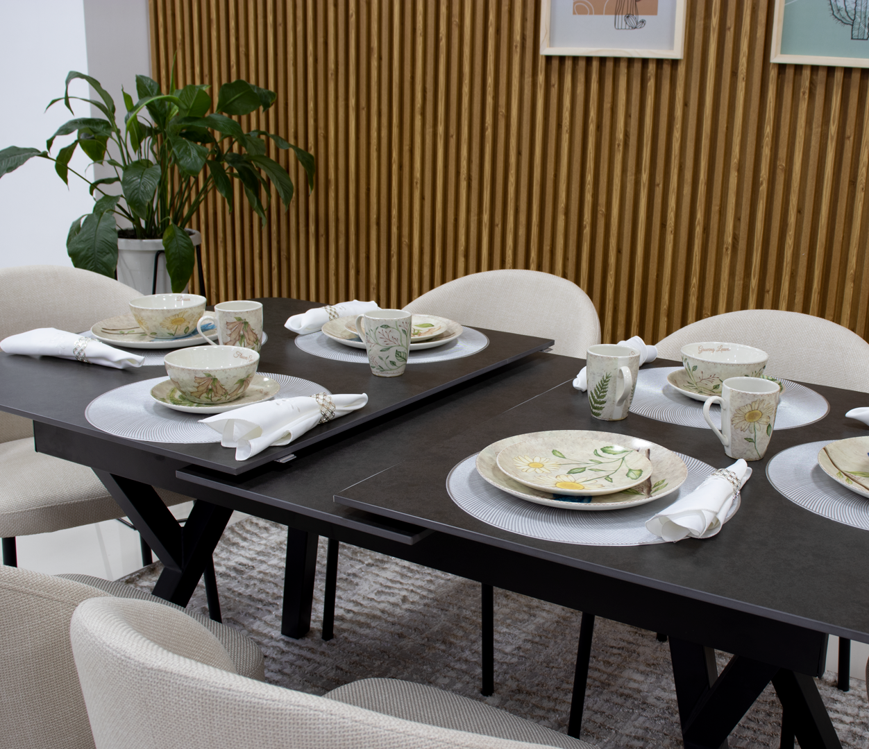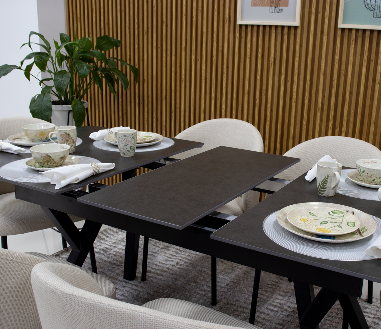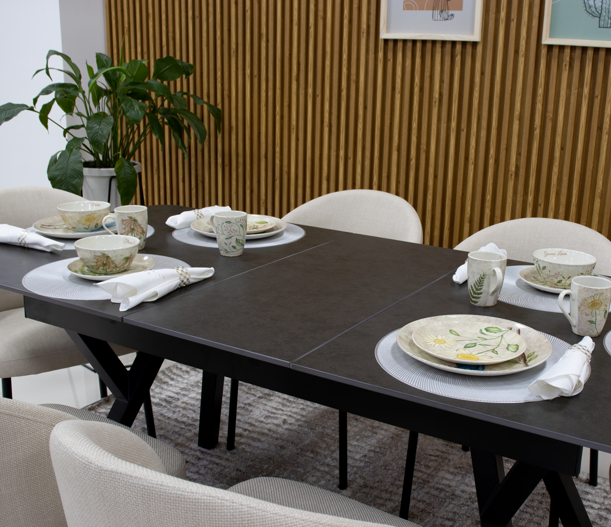 La mesa extensible combina diseño contemporáneo, funcionalidad y resistencia. Su superficie en piedra sinterizada aporta elegancia y durabilidad, mientras que su estructura metálica con acabado negro mate garantiza estabilidad y estilo moderno. Ideal para espacios que requieren versatilidad, pasa fácilmente de 6 a 8 puestos con un sistema de extensión práctico y seguro.