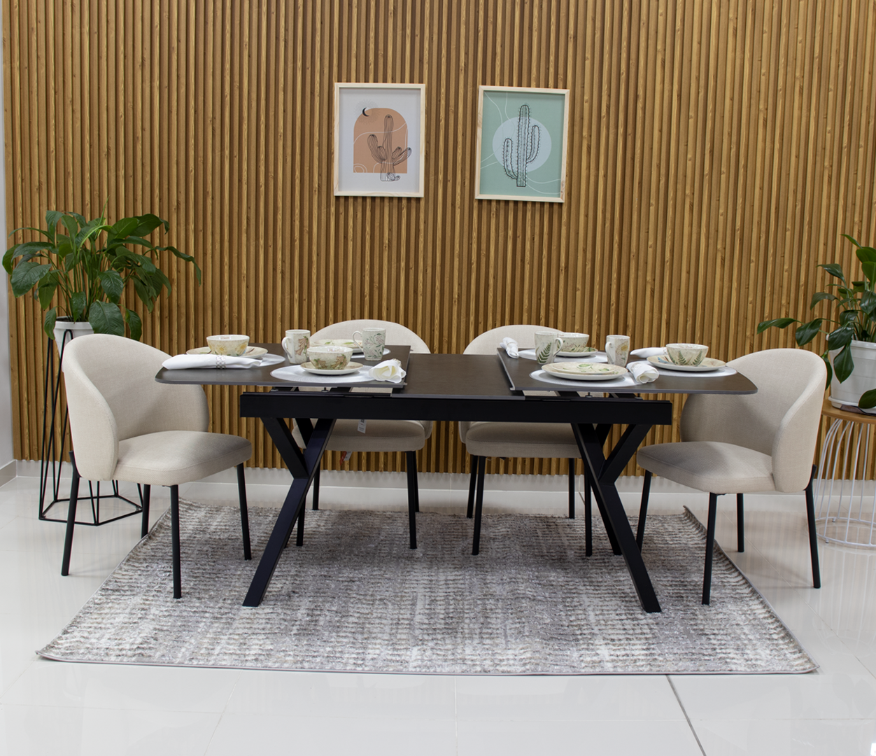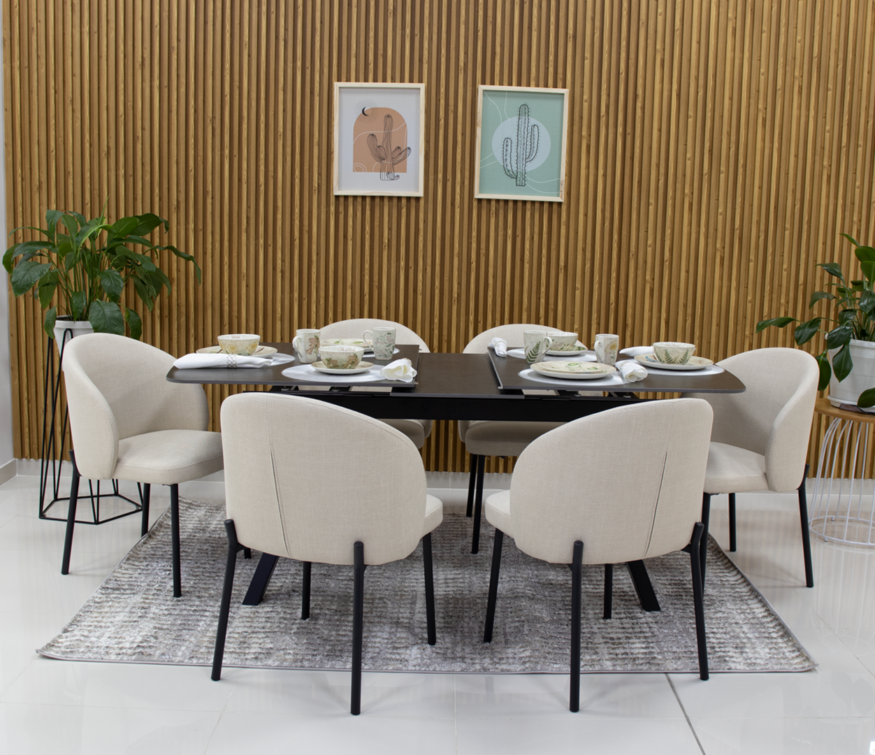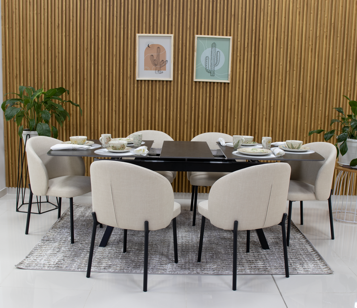 La mesa extensible combina diseño contemporáneo, funcionalidad y resistencia. Su superficie en piedra sinterizada aporta elegancia y durabilidad, mientras que su estructura metálica con acabado negro mate garantiza estabilidad y estilo moderno. Ideal para espacios que requieren versatilidad, pasa fácilmente de 6 a 8 puestos con un sistema de extensión práctico y seguro.