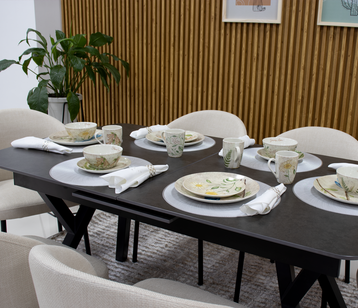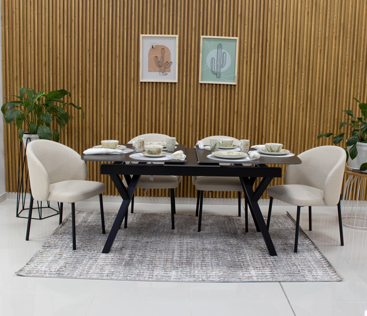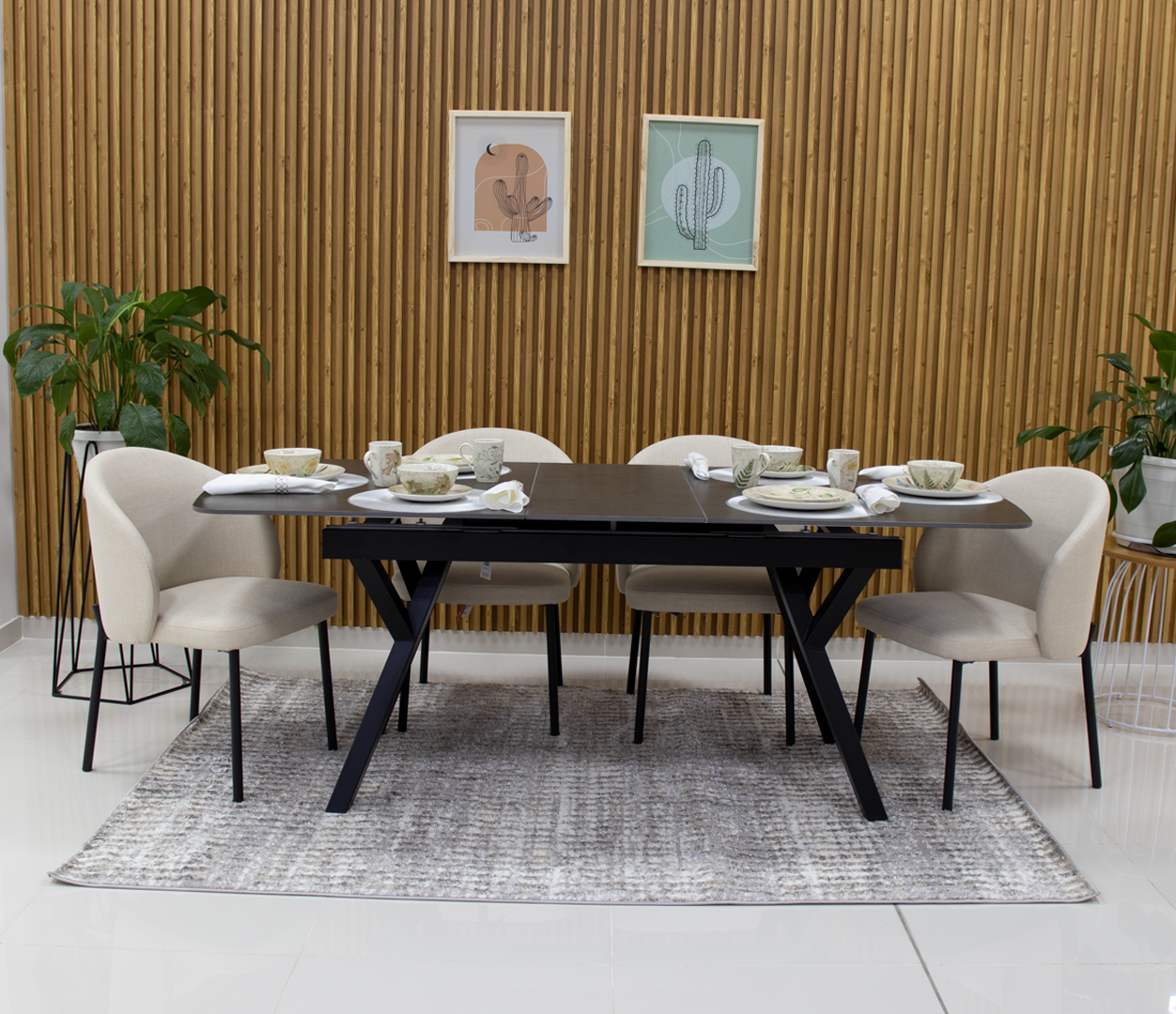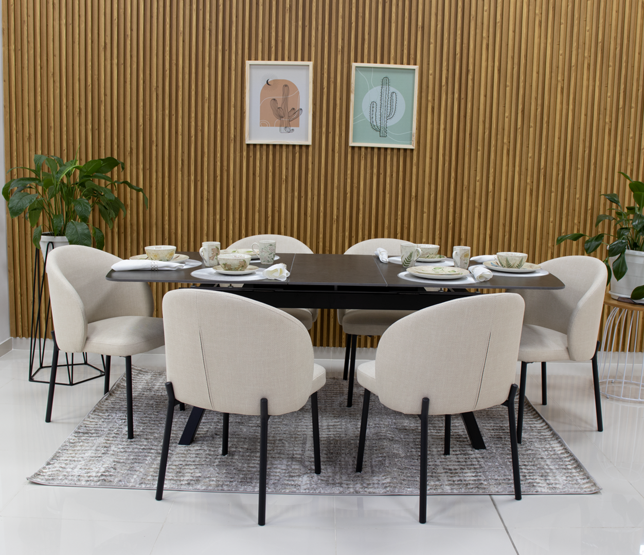 La mesa extensible combina diseño contemporáneo, funcionalidad y resistencia. Su superficie en piedra sinterizada aporta elegancia y durabilidad, mientras que su estructura metálica con acabado negro mate garantiza estabilidad y estilo moderno. Ideal para espacios que requieren versatilidad, pasa fácilmente de 6 a 8 puestos con un sistema de extensión práctico y seguro.