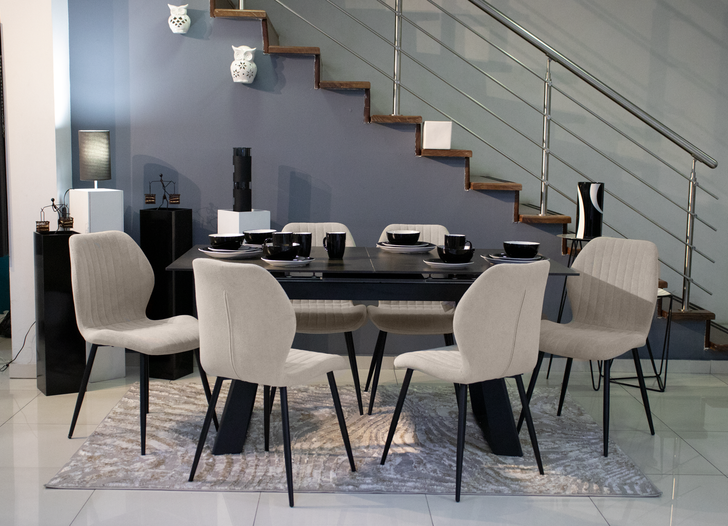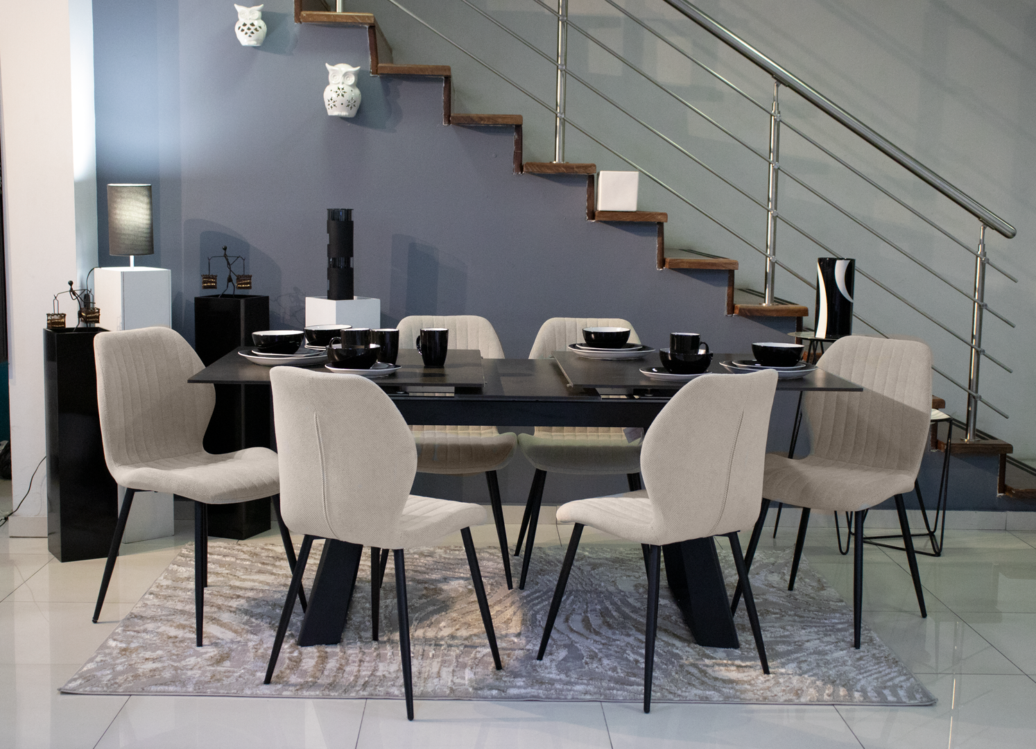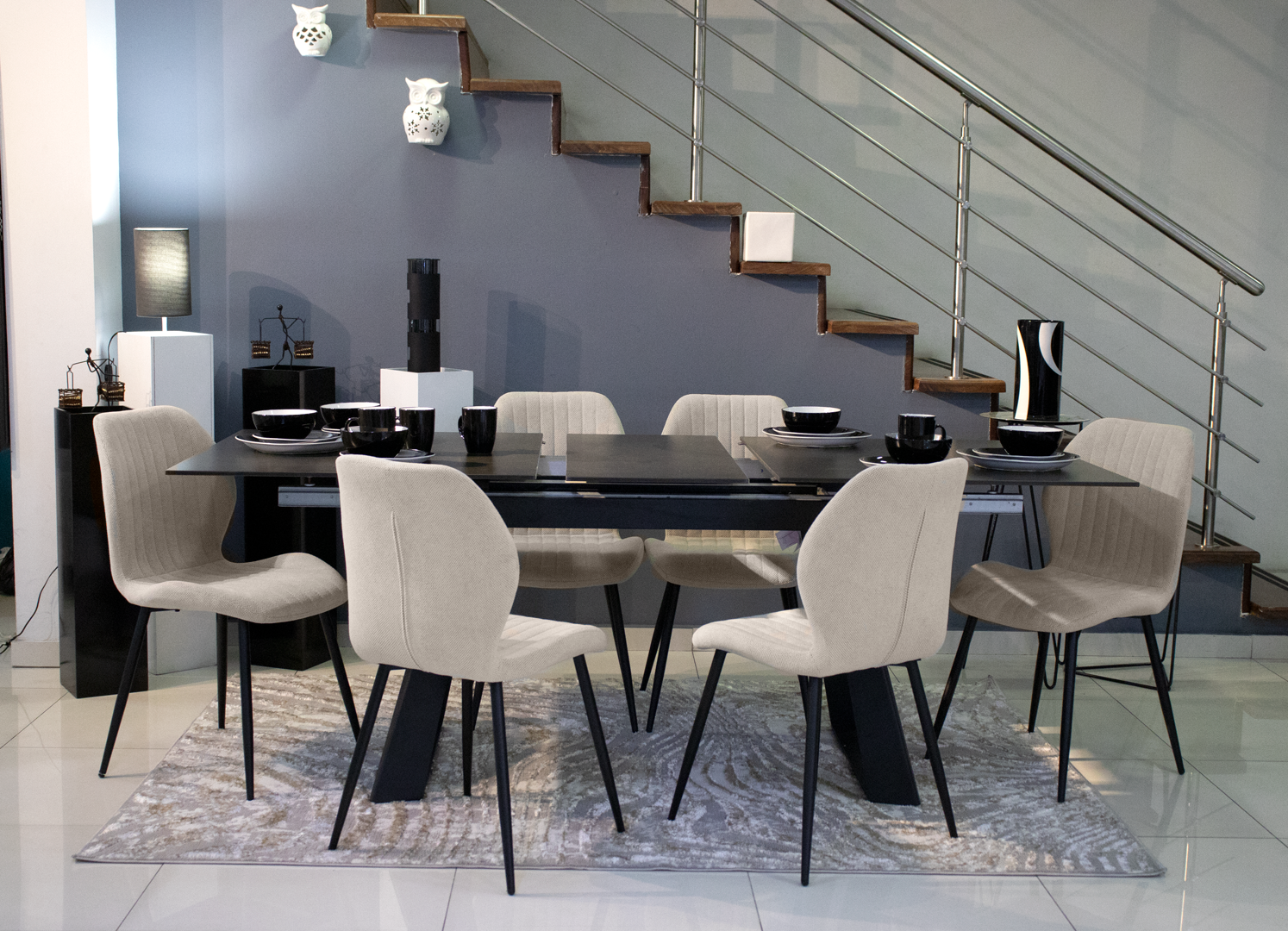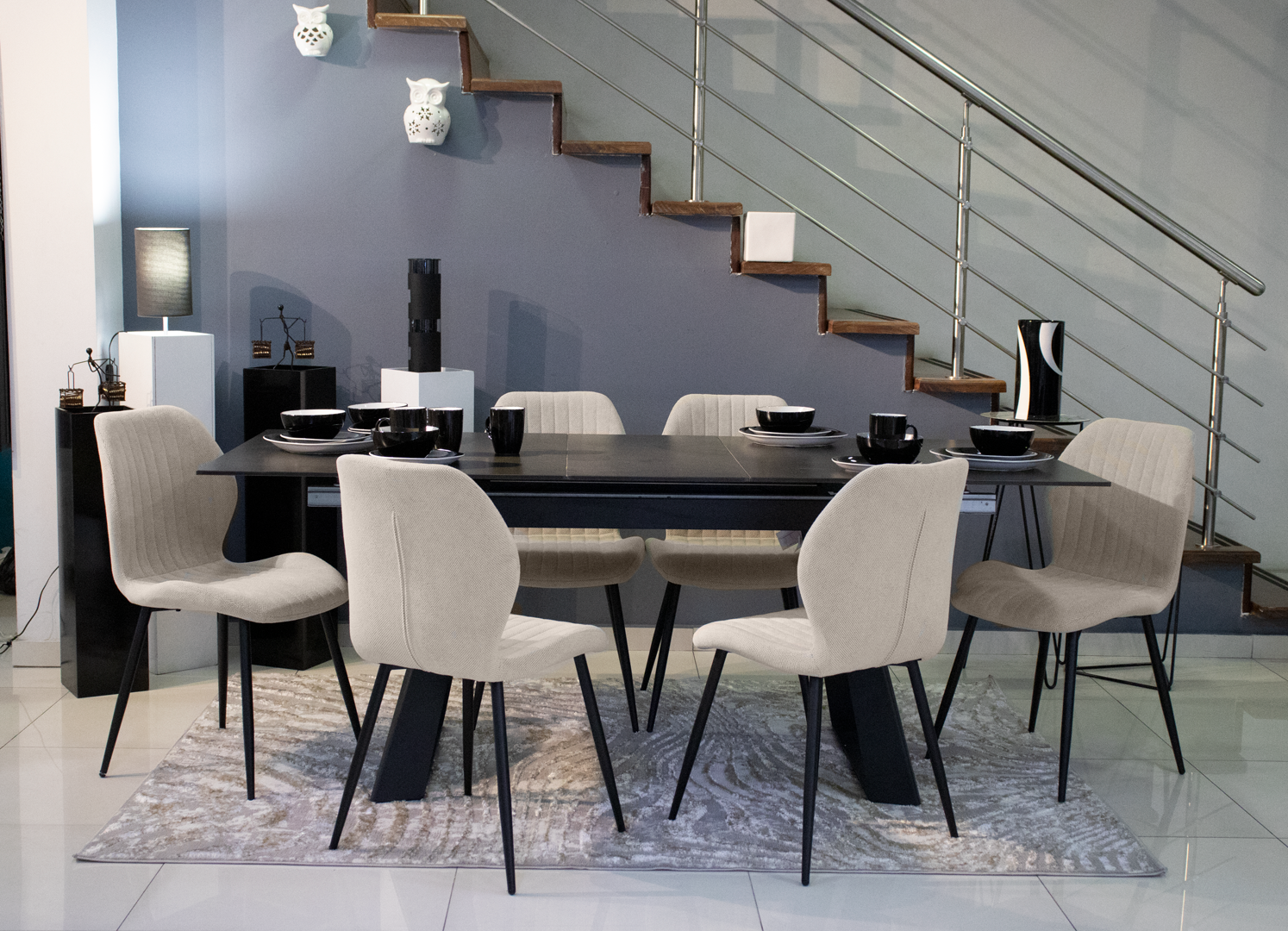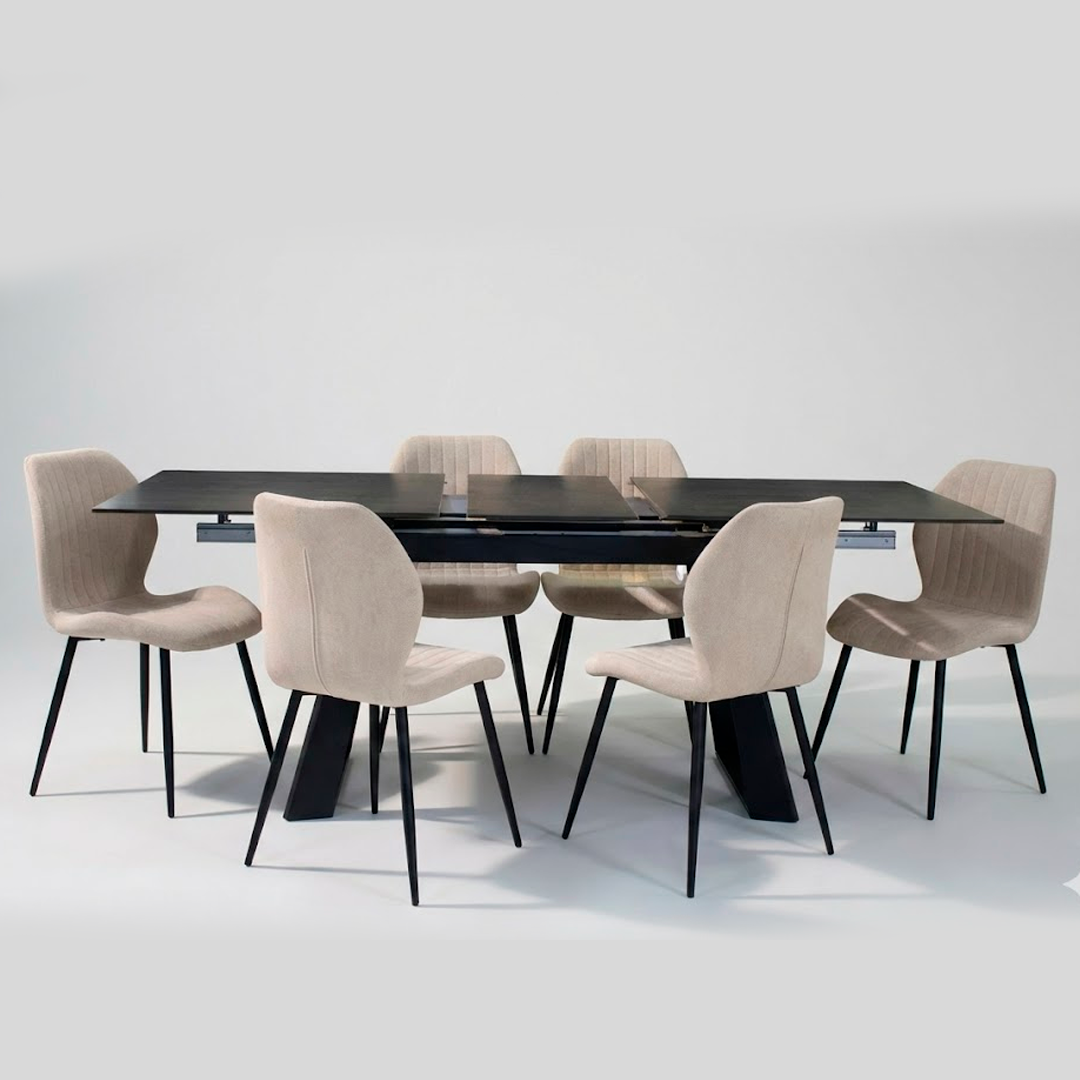 Con un diseño moderno e impactante, gracias a la posibilidad de extender el tablero, la mesa Toscana es adecuada para cualquier comedor, cocina, sala de estar y tipo de decoración. Al añadir simplemente la extensión en el centro, la mesa alcanza una longitud de 200 cm para dar cabida a más comensales. La parte superior de piedra sinterizada es particularmente duradera y resistente, y está acabada con un elegante efecto mármol disponible en color negro. Las patas de metal con un exclusivo diseño trapezoidal garantizan solidez y estabilidad, incluso en su máxima extensión.